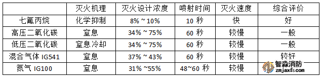 綜合以上參數(shù),可以發(fā)現(xiàn)七氟丙烷在滅火效能相較其他系統(tǒng)出色,應用于配電室、機房等場所時,能在很短時間內(nèi)將初始火情撲滅。