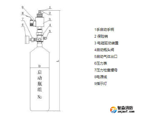 IG541混合氣體啟動瓶組由貯存鋼瓶、瓶頭閥、壓力表、電磁驅(qū)動裝置(帶手啟動手 柄及保險銷)組成,瓶內(nèi)充裝氮氣(N2),作為驅(qū)動氣體。瓶組容積有4L、7L、40L三種規(guī)格。4L、7L有標準的瓶組架,40L可安裝于滅火劑瓶組架 兩側(cè),也可定制瓶組架。啟動瓶組有自動和應急操作兩種啟動方式。自動啟動受來自火災自動報警控制器的控制,電磁驅(qū)動裝置動作,啟動瓶組開啟,實現(xiàn)自動啟 動。若自動啟動失靈或無法實現(xiàn),需進行機械應急操作,拔下電磁驅(qū)動裝置上保險銷(見圖),用手按下手啟動手柄(見圖),啟動瓶組開啟,實現(xiàn)應急操作啟動。 啟動瓶組的壓力表后部有檢測壓力的螺母,在檢測啟動瓶組壓力時,用扳手按逆時針方向旋轉(zhuǎn)螺母至壓力顯示,檢測完畢后,按順時針方向旋緊,然后逆時針旋松壓 力表,放掉壓力表內(nèi)氣壓,使指針回零,再把壓力表復位。